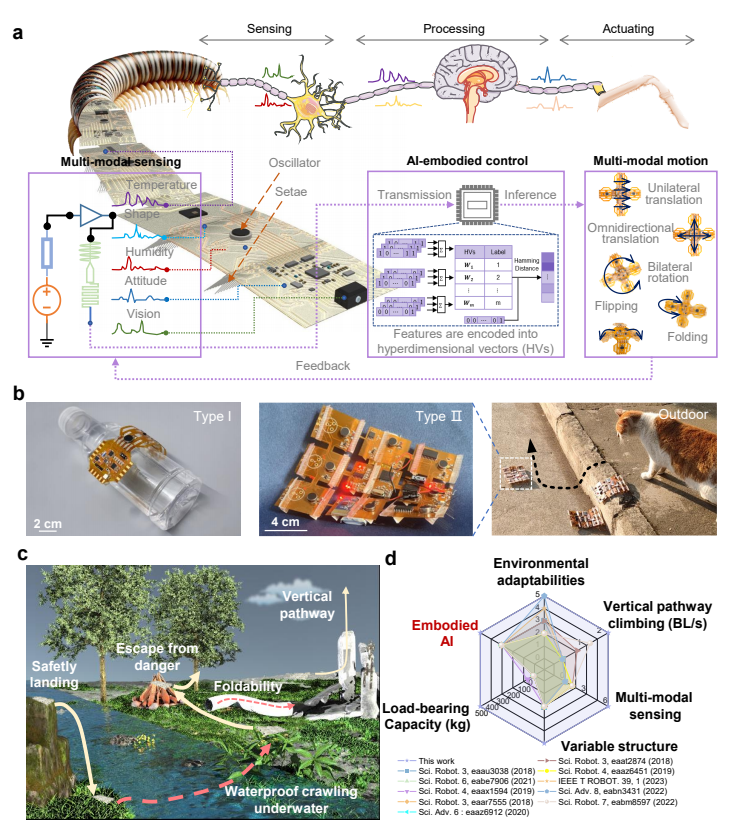 具身智能柔性电子机器人。a) FEbot示意图;b) FEbot实物样机;c) FEbots自主感知-认知-驱动与物理世界交互;d) FEbots性能比较。